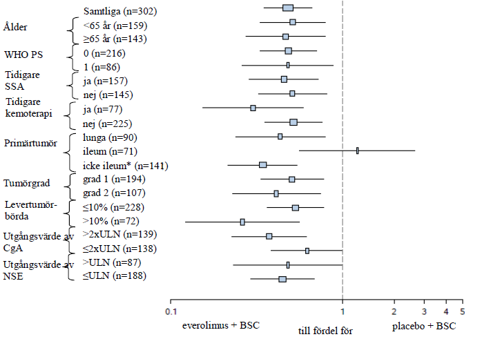 I understödjande analyser observerades en positiv behandlingseffekt i alla subgrupper med undantag för subgruppen som hade primärtumör med ursprung i ileum (ileum: HR=1,22 [95 % KI: 0,56–2,65], icke ileum: HR=0,34 [95 % KI: 0,22–0,54], lunga: HR=0,43 [95 % KI: 0,24–0,79]) (se figur 5).
