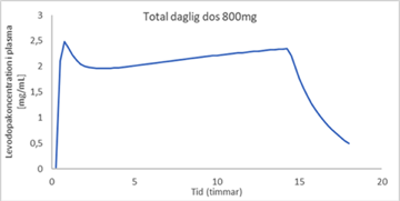 Figur 1: Exempel på levodopa plasmakoncentration/tidsprofil för en total daglig dos av 800mg levodopa med morgondos (176mg) och kontinuerlig underhållsdos (45mg/h) över dagen. (Simulering från en populations-PK-modell).