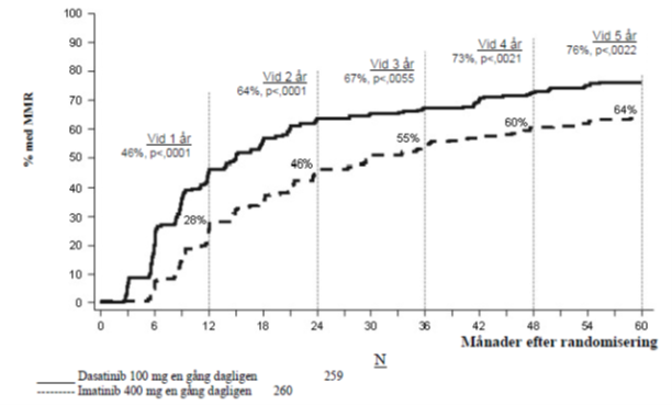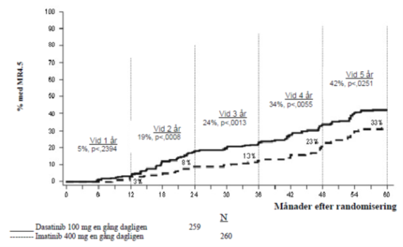 d Kriterier för betydande molekylärt svar: Definieras som BCR-ABL/kontrolltranskript ≤0,1% analyserat med RQ-PCR i perifert blod.