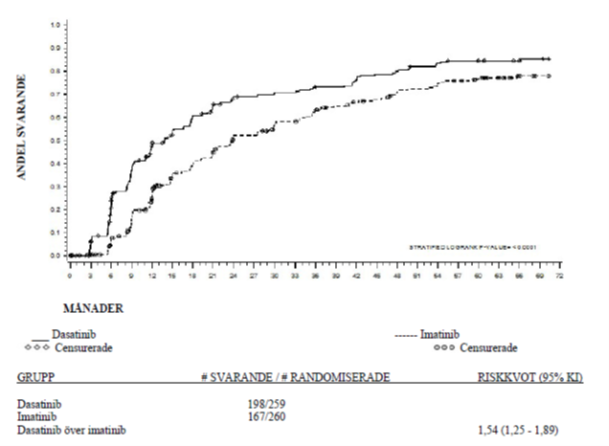 Andelen patienter som bibehöll MCyR i 18 månader var 93% (95% KI: [88%-98%]) för de som behandlades med dasatinib 100 mg en gång dagligen baserat på Kaplan-Meier-beräkningar.