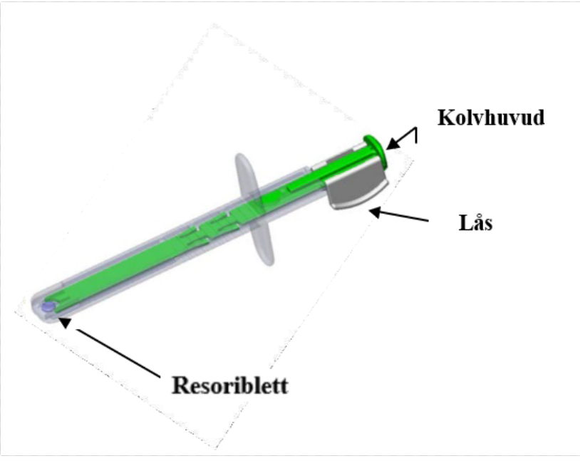 6. Tryck in det gröna kolvhuvudet för att överföra resoribletten under patientens tunga (sublingualt) och kontrollera resoriblettens placering.