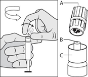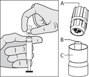 Håll sprutan upprätt i den räfflade delen (C). Ta med andra handen tag i locket (PRTC Plastic Rigid Tip Cap) (A) och vrid försiktigt locket moturs.