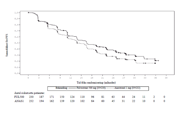 Två kliniska studier i fas 3 genomfördes på totalt 851 postmenopausala kvinnor med avancerad bröstcancer, vilka antingen fick återfall i sjukdomen under eller efter adjuvant hormonell behandling eller progredierade efter hormonell behandling vid avancerad sjukdom. Sjuttiosju procent (77 %) av studiepopulationen hade östrogenreceptorpositiv bröstcancer. I dessa studier jämfördes säkerhet och effekt vid månadsvis administrering av fulvestrant 250 mg med en daglig administrering av 1 mg anastrozol (aromatashämmare). Sammantaget var fulvestrant, vid månadsvis dosering 250 mg, minst lika effektivt som anastrozol vad gällde progressionsfri överlevnad, objektiv respons och tid till död. Det fanns inga statistiskt signifikanta skillnader i några av dessa effektmått (endpoints) mellan de två behandlingsgrupperna. Progressionsfri överlevnad var primärt effektmått. En kombinerad analys av båda studierna visade att 83 % av patienterna som fick fulvestrant progredierade i sin sjukdom, jämfört med 85 % av patienterna som fick anastrozol. Kombinerad analys av båda studierna visade att riskförhållandet (hazard ratio) mellan fulvestrant 250 mg och anastrozol vad gäller progressionsfri överlevnad var 0,95 (95 % CI 0,82 till 1,10). Den objektiva responsen var 19,2 % för fulvestrant 250 mg jämfört med 16,5 % för anastrozol. Mediantid till död var 27,4 månader för patienter som behandlats med fulvestrant och 27,6 månader för patienter som behandlats med anastrozol. Riskförhållandet mellan fulvestrant 250 mg och anastrozol vad gäller tid till död var 1,01 (95 % CI 0,86 till 1,19).