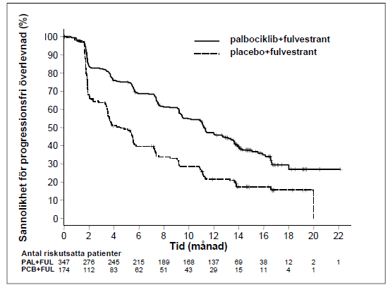 En minskad risk för sjukdomsprogression eller död i armen fulvestrant plus palbociklib observerades i alla individuella patientundergrupper definierat genom stratifieringsfaktorer och baslinjekarakteristika. Detta var tydligt hos pre/perimenopausala kvinnor (HR på 0,46 [95 % CI: 0,28, 0,75]) och postmenopausala kvinnor (HR på 0,52 [95 % CI: 0,40, 0,66]) och patienter med visceral metastatisk sjukdom (HR på 0,50 [95 % CI: 0,38, 0,65]) och icke-visceral metastatisk sjukdom (HR på 0,48 [95 % CI: 0,33, 0,71]). Nyttan kunde även observeras oberoende av tidigare behandlingslinjer i det metastatiska tillståndet, om 0 (HR på 0,59 [95 % CI: 0,37, 0,93]), 1 (HR på 0,46 [95 % CI: 0,32, 0,64]), 2 (HR på 0,48 [95 % CI: 0,30, 0,76]), eller ≥3 linjer (HR på 0,59 [95 % CI: 0,28, 1,22]).