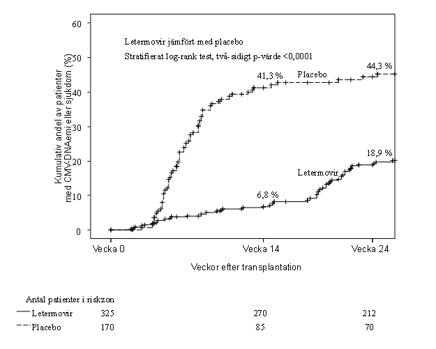 I en fas 3‑studie (P001) har säkerheten och effekten av letermovir fastställts hos HSCT‑patienter med negativt testresultat för CMV‑DNA före initiering av profylaktisk behandling. CMV‑DNA monitorerades veckovis till vecka 14 efter transplantation och därefter varannan vecka till vecka 24. Profylax med letermovir avbröts och preemptiv standardbehandling (PET) påbörjades vid kliniskt signifikant CMV‑DNAemi eller sjukdom. För patienter där profylax med letermovir påbörjades och för vilka test av CMV‑DNA vid baseline senare visade sig vara positivt, kunde profylaktisk behandling fortsätta om kriterierna för PET inte hade uppfyllts (se avsnitt 5.1).