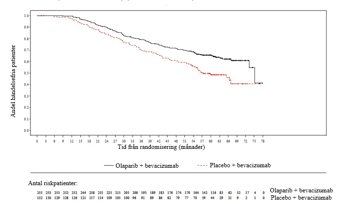 Resultaten för patienter med pMMR-tumörstatus sammanfattas i tabell 18 och figur 21. Median uppföljningstid hos censurerade patienter med pMMR-tumörstatus var 15,2 månader i armen med platinumbaserad cytostatikabehandling + durvalumab + olaparib och 12,8 månader i armen med platinumbaserad cytostatikabehandling. Vid tidpunkten för PFS-analysen hade interimsdata för OS 29 % mognad med händelser hos 110 av 383 patienter.