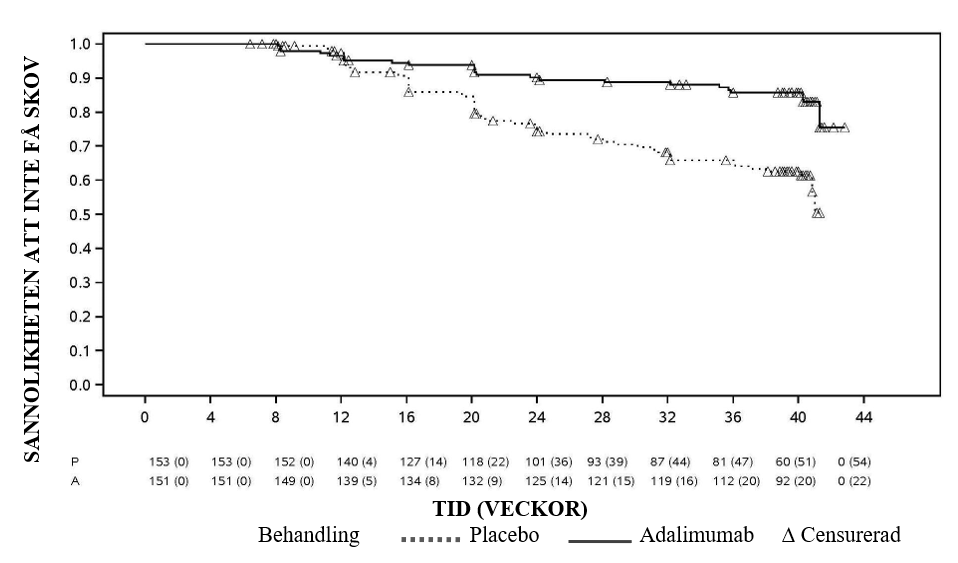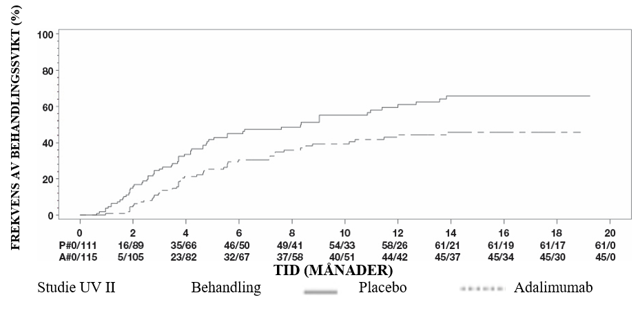 Adalimumab fördröjde signifikant tiden till behandlingssvikt i jämförelse med placebo (se figur 3, P < 0,0001 från log rank test). Mediantiden till behandlingssvikt var 24,1 veckor för patienter som behandlades med placebo, medan mediantiden till behandlingssvikt för patienter som behandlades med adalimumab inte gick att fastställa eftersom mindre än hälften av dessa patienter uppvisade behandlingssvikt. Adalimumab minskade signifikant risken för behandlingssvikt med 75% jämfört med placebo, vilket framgår av hazardkvoten (HR = 0,25 [95% CI: 0,12; 0,49]).