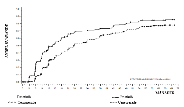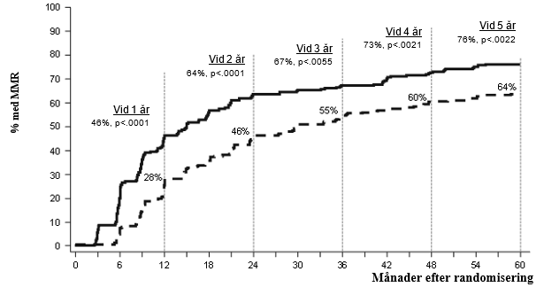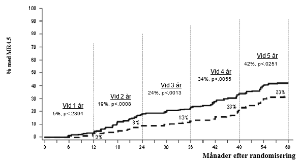 Viktiga effektmått var: fullständigt cytogenetiskt svar (CCyR), större cytogenetiskt svar (MCyR) och större molekylärt svar (MMR). Resultaten redovisas i tabell 15.