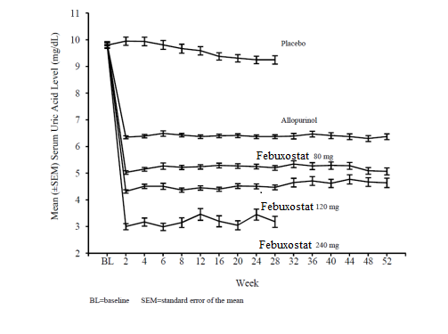 Observera: 509 patienter fick 300 mg allopurinol dagligen; 10 patienter med serumkreatinin > 1,5 och ≤ 2,0 mg/dl fick dosen 100 mg dagligen. (10 av 268 patienter i APEX-studien). 240 mg febuxostat användes för att utvärdera säkerheten hos febuxostat vid dubbla rekommenderad högsta dos.
