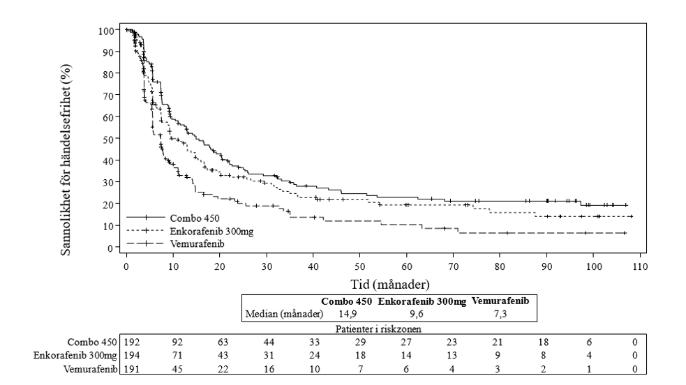 Den slutliga effektanalysen överensstämde med resultaten från interimsanalysen och visade på bättre resultat för OS med Combo 450 än med vemurafenib (HR 0,67 [95 % CI: 0,53; 0,84] med en median-OS på 33,6 månader vs 16,9 månader). Resultaten för PFS och ORR (enligt BIRC) bekräftade också en numerisk fördel för Combo 450, med 7,6 månader längre median-PFS i Combo 450-armen än i vemurafenibarmen. Detaljerad information om de slutliga effektresultaten finns i tabell 5 och figur 1 och 2 nedan.
