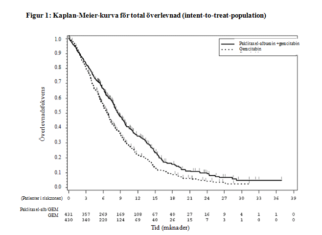 Det sågs en statistiskt signifikant förbättring av total överlevnad för patienter som behandlades med nanopartiklar av humant serumalbumin-paklitaxel/gemcitabin jämfört med enbart gemcitabin, med en ökning på 1,8 månader av total medianöverlevnad, 28 % total minskning av risk för dödsfall, 59 % förbättring av frekvenserna för 1-årsöverlevnad och 125 % förbättring av frekvenserna för 2-årsöverlevnad.
