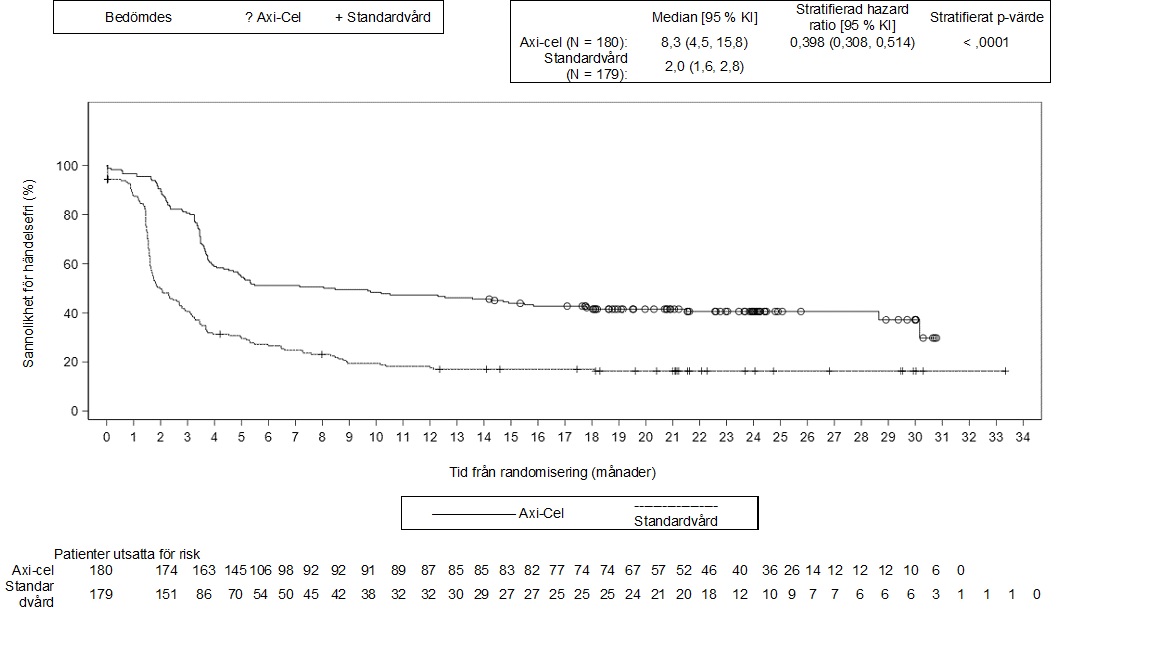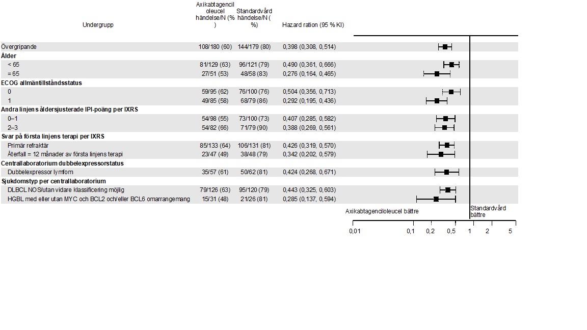 Konsistent effekt till stöd för Yescarta observerades över lag över valda undergrupper, inklusive svar på första linjens terapi, andra linjens ålderjusterade IPI-poäng, ECOG-allmäntillståndsstatus, ålder, dubbelexpressor lymfomstatus och HGBL-sjukdomsundergrupp (se figur 3). Bland patienter med HGBL per centrallaboratorium visade Yescarta en förbättring för EFS jämfört med standardvårdgruppen (HR: 0,285 [95 % KI: 0,137, 0,594]). ORR var 81 % (95 % KI: 62,5 %, 92,5 %) och CR frekvensen var 68 % (95 % KI: 48,6 %, 83,3 %) hos patienter som behandlades med Yescarta jämfört med 42 % (95 % KI: 23,4 %, 63,1 %) och 23 % (95 % KI: 9,0 %, 43,6 %) i standardvårdarmen. OS HR för Yescarta