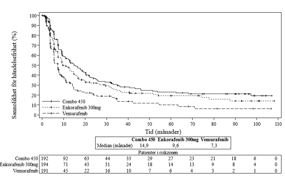 I säkerhetsanalysen av poolade studier var incidensen av nya fall av QTc-förlängning på > 500 ms 1,1 % (4/363) i Combo 450 ISP (n=372), medan den var 2,5 % (5/203) i gruppen som fick enbart enkorafenib och som hade melanom. QTcF-förlängning med > 60 ms jämfört med värdena före behandling observerades hos 6,0 % (22/364) av patienterna i Combo 450 ISP, samt hos 3,4 % (7/204) av patienterna i gruppen som enbart fick enkorafenib (se avsnitt 4.2 och 4.4).