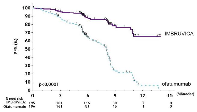 Med en medianuppföljningstid på 65 månader i studie PCYC-1112-CA observerades en 85 % minskning av risken för dödsfall eller progression enligt prövarens bedömning för patienter i IMBRUVICA-gruppen. Medianen för prövarbedömd PFS enligt IWCLL-kriterierna var 44,1 månader [95 % CI (38,47; 56,18)] i IMBRUVICA-gruppen respektive 8,1 månader [95 % CI (7,79; 8,25)] i ofatumumabgruppen; HR = 0,15 [95 % CI (0,11; 0,20)]. Den uppdaterade Kaplan-Meier-kurvan för PFS visas i figur 13. Prövarbedömd ORR i IMBRUVICA-gruppen var 87,7 % jämfört med 22,4 % i ofatumumabgruppen. Vid tidpunkten för den slutliga analysen hade 133 (67,9 %) av de 196 försökspersonerna som ursprungligen randomiserats till behandlingsgruppen med ofatumumab gått över till ibrutinibbehandlingen. Medianen för prövarbedömd PFS2 (tid från randomisering till PFS-händelse efter första efterföljande antineoplastiska behandlingen) enligt IWCLL kriterierna var 65,4 månader [95 % CI (51,61; kan inte uppskattas)] i IMBRUVICA-gruppen respektive 38,5 månader [95 % CI (19,98; 47,24)] i ofatumumabgruppen; HR = 0,54 [95 % CI (0,41; 0,71)]. Medianen för OS var 67,7 månader [95 % CI (61,0; kan inte uppskattas)] i IMBRUVICA-gruppen.