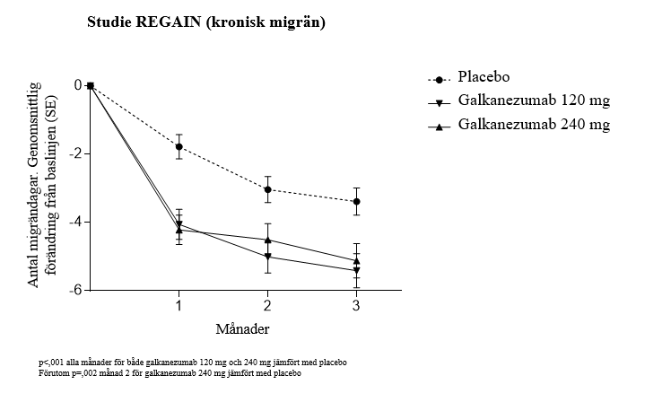 REGAIN-studien omfattade en 3 månader lång dubbelblind, placebokontrollerad behandlingsperiod som följdes av en öppen förlängningsfas på 9 månader. Cirka 15 % av patienterna fortsatte sin behandling med topiramat eller propranolol som migränprofylax på det sätt som var godkänt i protokollet. Bland patienterna som fick galkanezumab avslutade 95,3% hela den dubbelblinda behandlingsfasen.