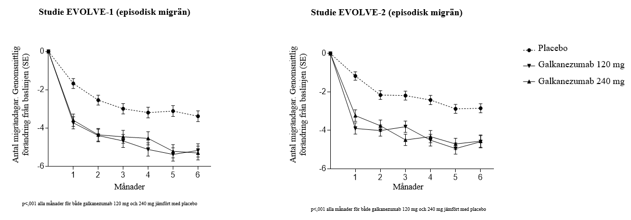 Studierna EVOLVE-1 och EVOLVE-2 omfattade en 6 månader lång dubbelblind, placebokontrollerad behandlingsperiod. Antalet patienter som fick galkanezumab och avslutade den dubbelblinda behandlingsfasen låg mellan 82,8 % och 87,7 %.