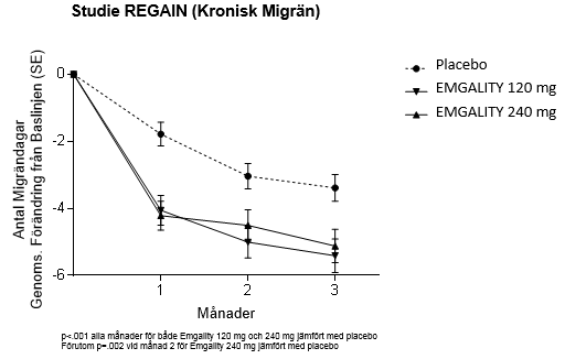 Behandlingsgrupperna med galkanezumab 120 mg eller 240 mg visade på statistiskt signifikant och meningsfull förbättring från baslinjen jämfört med placebo avseende medelförändringen av MHD (se tabell 2). Patienter som behandlades med galkanezumab hade högre responsfrekvens och större minskning i antalet månatliga MHD där akutbehandling togs jämfört med placebobehandlande patienter. Galkanezumab behandlade patienter visade en större förbättring i allmänfunktion (mätt enligt MSQ Role Fuction-Restrictive domän poäng) jämfört med placebo behandlade patienter från och med första månaden.