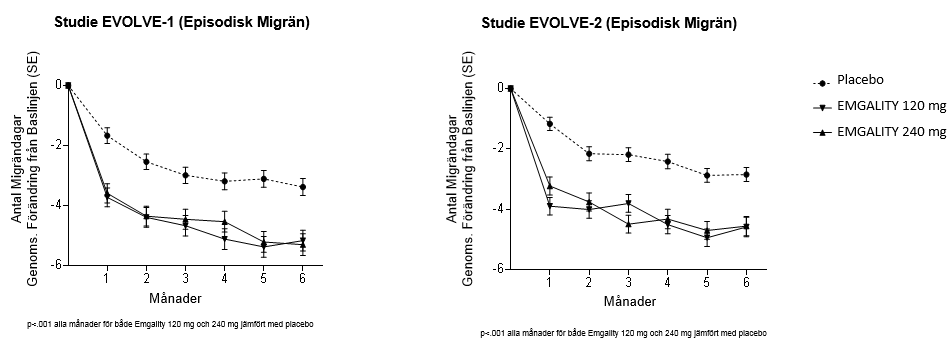 Jämfört med placebobehandlade patienter hade patienter som behandlades med galkanezumab 120 mg eller 240 mg signifikant större minskning av genomsnittligt antal månatliga MHD från baslinjen vid första månaden och vid alla efterföljande månader fram till månad 6 (se Figur 1). Vidare visade patienter som behandlades med galkanezumab (laddningsdos på 240 mg) i första månaden signifikant färre veckovisa MHD jämfört med placebobehandlade patienter, vecka 1 och varje efterföljande vecka.