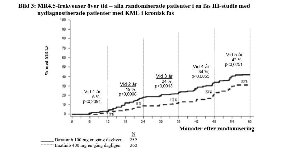 Frekvensen av betydande molekylärt svar (definierat som andel BCR-ABL/kontroll-transkript ≤ 0,1 % analyserat med RQ-PCR i perifert blod) före crossover var 29 % för dasatinib och 12 % för imatinib.
