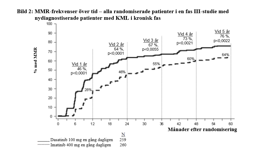 Frekvensen av betydande molekylärt svar vid 24 månader var 45 % (35 % för imatinib-resistenta patienter och 74 % för imatinib-intoleranta patienter).