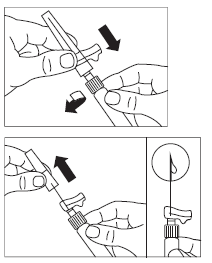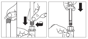 Dra av den mjuka vita kapsylen från den förfyllda sprutan med spädningsvätska och skruva på sprutan på flaskadaptern.