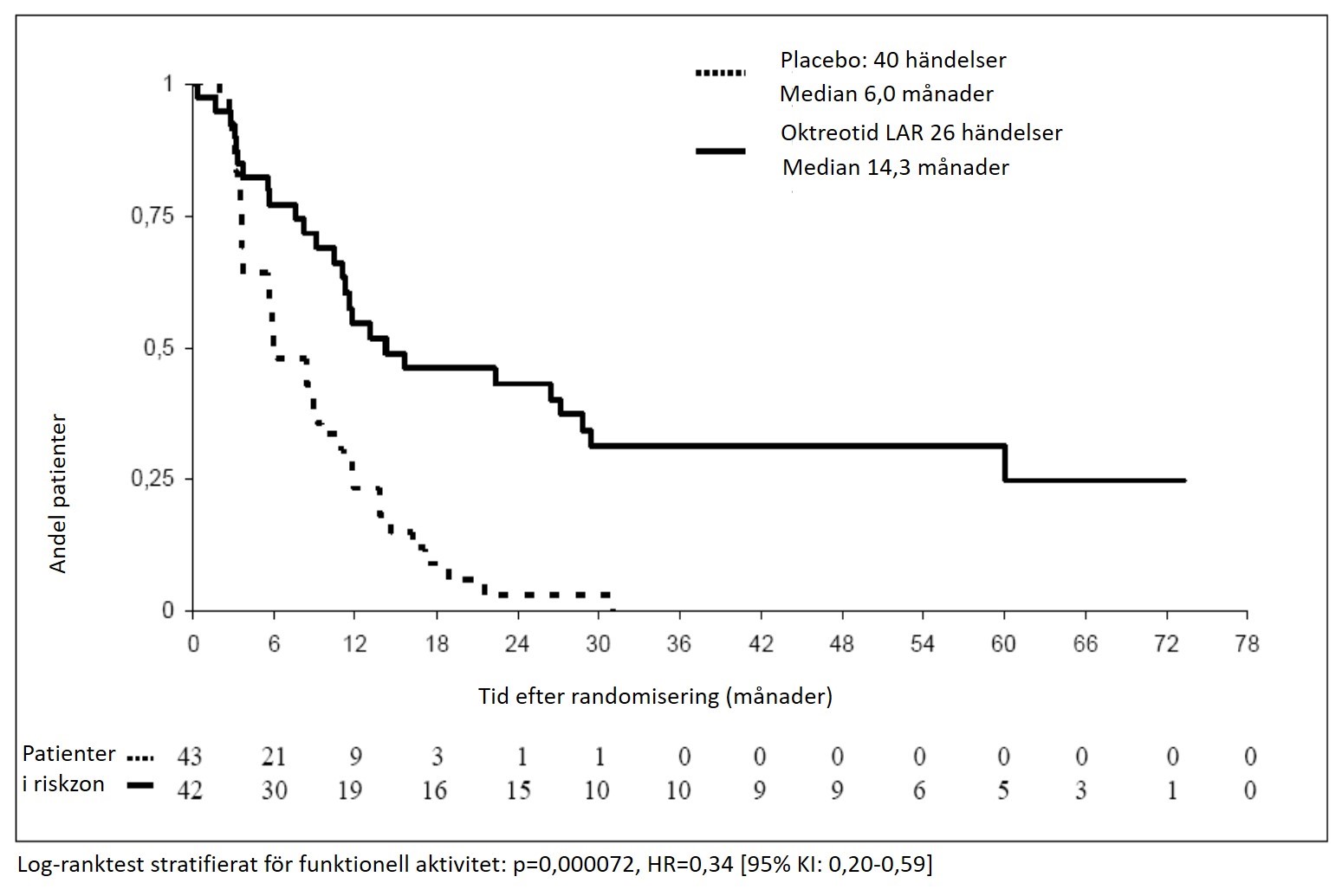 Behandlingseffekten var lika hos patienter med funktionellt aktiva (HR = 0,23, 95 % KI, 0,09 till 0,57) och inaktiva tumörer (HR = 0,25, 95 % KI, 0,10 till 0,59).