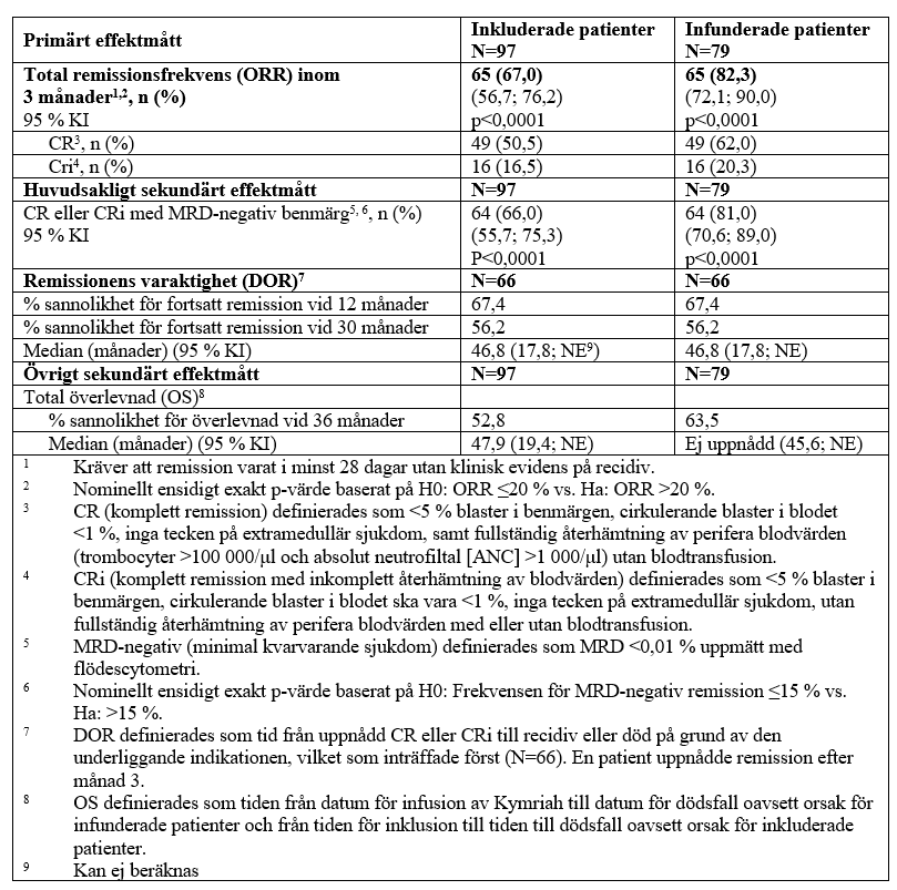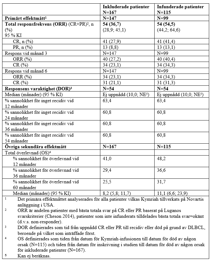 Effekten utvärderades genom det primära effektmåttet komplett responsfrekvens (complete response rate, CRR), registrerat från infusion till sjukdomsprogress eller start av ny behandling. CRR bestämdes av IRC baserat på Lugano klassificerings kriterier (Cheson 2014). Sekundära effektmått innefattade total svarsfrekvens (overall response rate, ORR), responsens varaktighet (duration of response DOR), progressionsfri överlevnad (PFS) och total överlevnad (overall survival, OS). Tiden från inskrivning i studien till infusion var i median 46 dagar (intervall: 23 till 127). Den första sjukdomsbedömningen var planerad att utföras 3 månader efter infusion.