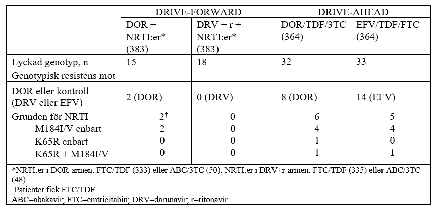 Effekten av doravirin baseras på analyser av 96‑veckorsdata från två randomiserade, multicenter, dubbelblinda, aktivt kontrollerade fas 3-prövningar (DRIVE‑FORWARD och DRIVE‑AHEAD) med hiv‑1-infekterade behandlingsnaiva deltagare som inte tidigare behandlats med antiretrovirala medel (n =1 494). Se avsnittet om resistens vad gäller NNRTI‑substitutioner som ingick i exklusionskriterierna.