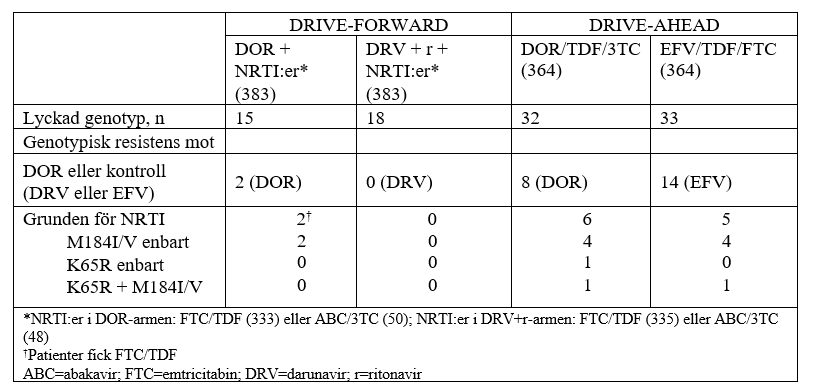 Effekten av doravirin baseras på analyser av 96‑veckorsdata från två randomiserade, multicenter, dubbelblinda, aktivt kontrollerade fas 3-prövningar (DRIVE‑FORWARD och DRIVE‑AHEAD) med hiv‑1-infekterade behandlingsnaiva deltagare som inte tidigare behandlats med antiretrovirala medel (n =1 494). Se avsnittet om resistens vad gäller NNRTI‑substitutioner som ingick i exklusionskriterierna.