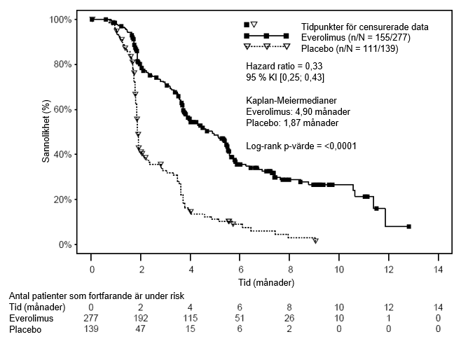 Everolimus var överlägset placebo vad avser primärt effektmått av progressionsfri överlevnad, med en statistiskt signifikant, 67 %, minskning av risken för progression eller dödsfall (se Tabell 7 och Figur 6).
