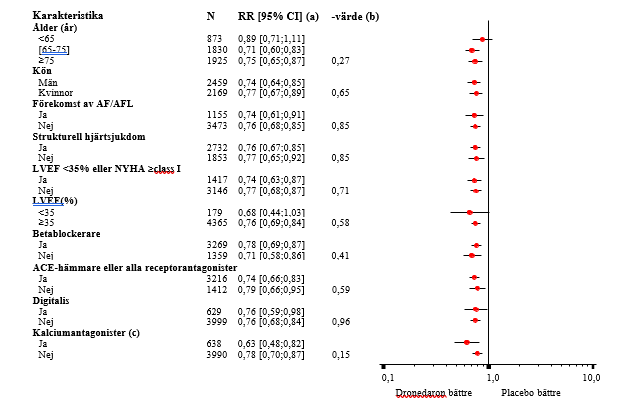 Antal dödsfall oavsett orsak under studiens gång var jämförbart mellan dronedaron- (116/2301) och placebogrupperna (139/2327).