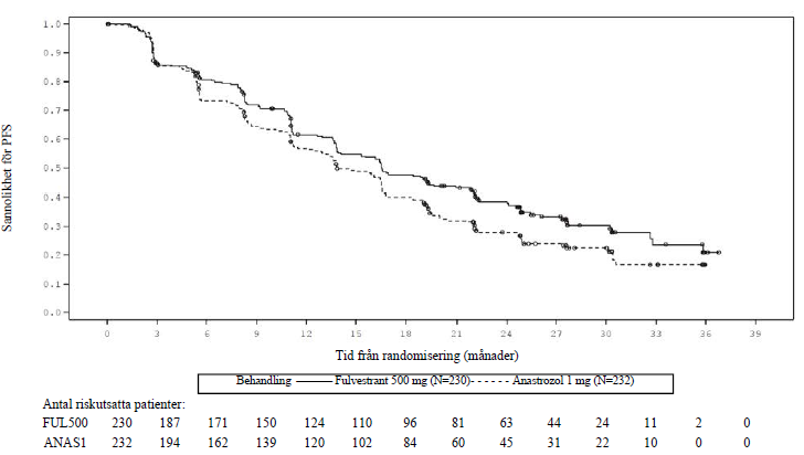 En fas 3, randomiserad, dubbelblind, dubbelplacebo, multicenterstudie av fulvestrant 500 mg jämfört med anastrozol 1 mg utfördes på postmenopausala kvinnor med ER-positiv och/eller PgR-positiv lokalt avancerad eller metastatisk bröstcancer som inte tidigare behandlats med någon hormonell behandling. Totalt randomiserades 462 patienter 1:1 i följd att få antingen fulvestrant 500 mg eller anastrozol 1 mg.