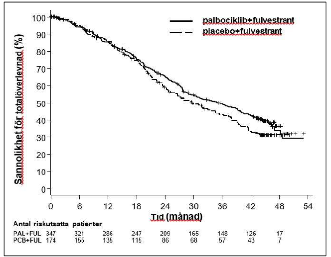 Efter en medianuppföljningstid på 45 månader utfördes den slutliga OS-analysen baserad på 310 händelser (60 % av de randomiserade patienterna). En skillnad på 6,9 månader i median OS observerades i armen palbociklib plus fulvestrant jämfört med armen placebo plus fulvestrant; resultatet var inte statistiskt signifikant vid den förspecificerade signifikansnivån på 0,0235 (1-sidig). I armen placebo plus fulvestrant fick 15,5 % av de randomiserade patienterna palbociklib och andra CDK-hämmare som efterföljande behandlingar efter progression.