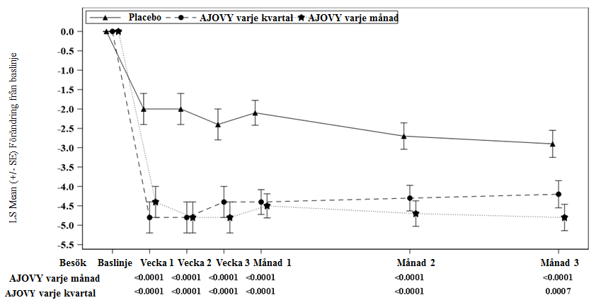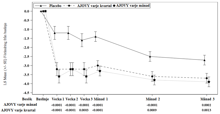 Medelvärde vid baslinje (genomsnittligt antal huvudvärksdagar per månad med minst måttlig svårighetsgrad): placebo: 13,3, AJOVY varje kvartal: 13,2, AJOVY varje månad: 12,8.
