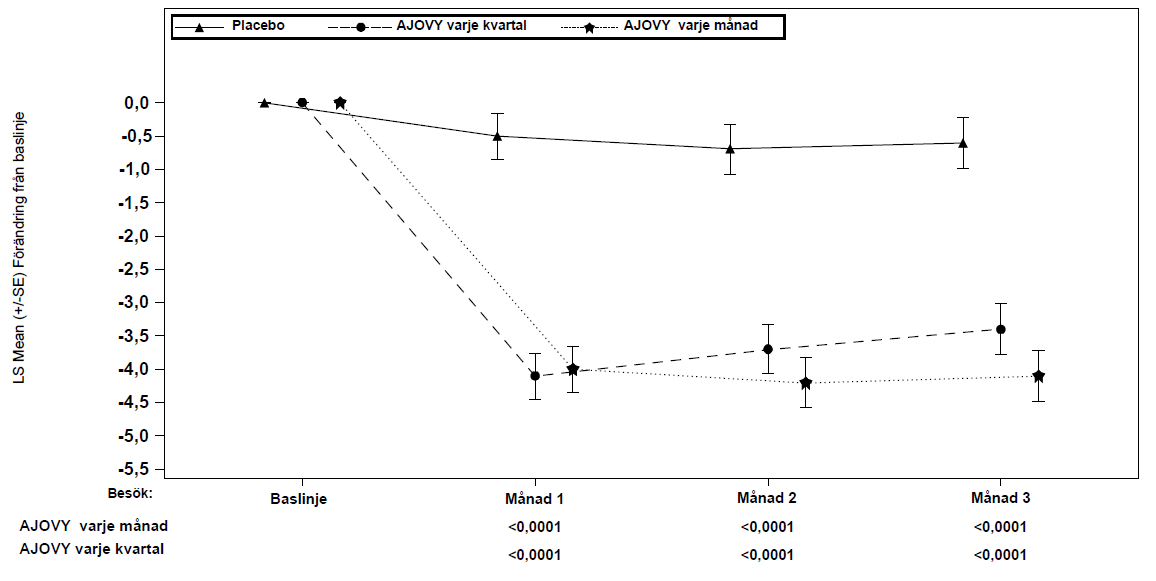 Medelvärde vid baslinje (genomsnittligt antal migrändagar per månad): placebo: 9,1, AJOVY varje kvartal: 9,2, AJOVY varje månad: 8,9