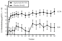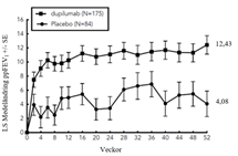 QUEST-studien och fick antingen 200 mg (N=21) eller 300 mg (N=18) dupilumab (eller motsvarande placebo antingen 200 mg [N=34] eller 300 mg [N=34]) varannan vecka. Effekt med avseende på allvarliga astmaexacerbationer och lungfunktion observerades hos både ungdomar och vuxna. För både doserna 200 mg och 300 mg varannan vecka observerades signifikanta förbättringar i FEV1 (LS-medeländring från baslinjen vid vecka 12) (0,36 l respektive 0,27 l). För dosen 200 mg varannan vecka hade patienterna en minskning av frekvensen av allvarliga exacerbationer som var förenliga med vuxna. Säkerhetsprofilen hos ungdomar var i allmänhet liknande vuxna.