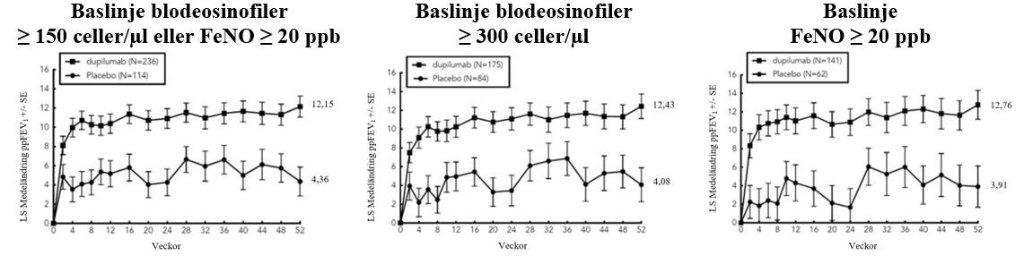 I populationen som definieras av blodesinofiler ≥ 300 celler/µl vid baslinjen var LS‑medelförändring 0,22 l pre-bronkodilator FEV1 från baslinjen vid vecka 12 i dupilumabgruppen och 0,12 l i placebogruppen, med en LS-medelförändring jämfört med placebo på 0,10 l (95% KI: 0,0,03). Behandlingseffekten bibehölls under den 52 veckor långa behandlingsperioden, med en LS- medelförändring jämfört med placebo vid vecka 52 på 0,17 l (95% KI: 0, 09, 0,26).
