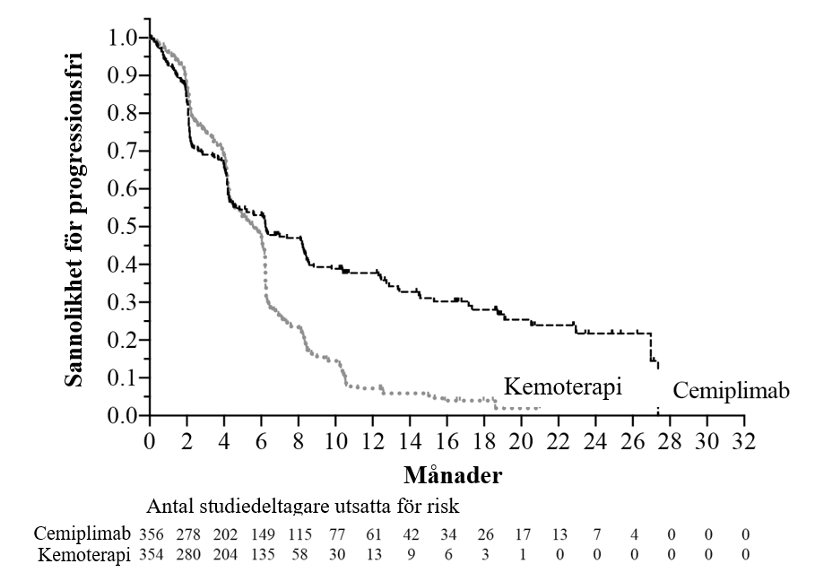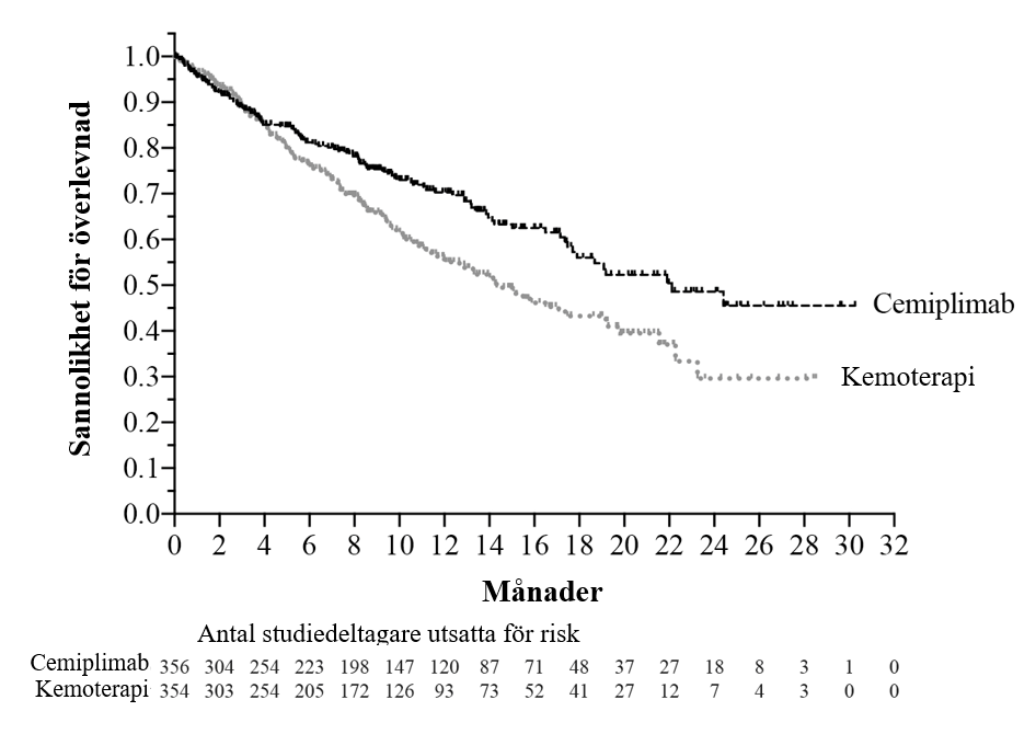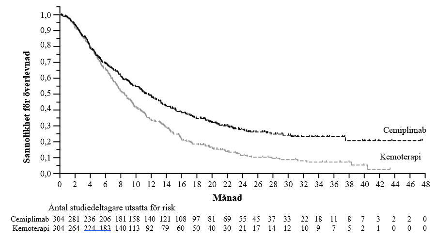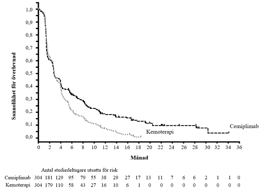 Vid primär analys i den totala populationen med en median uppföljningstid på 16,4 månader visade studien statistiskt signifikant förbättring i OS för patienter som randomiserades till cemiplimab i kombination med kemoterapi jämfört med placebo i kombination med kemoterapi.