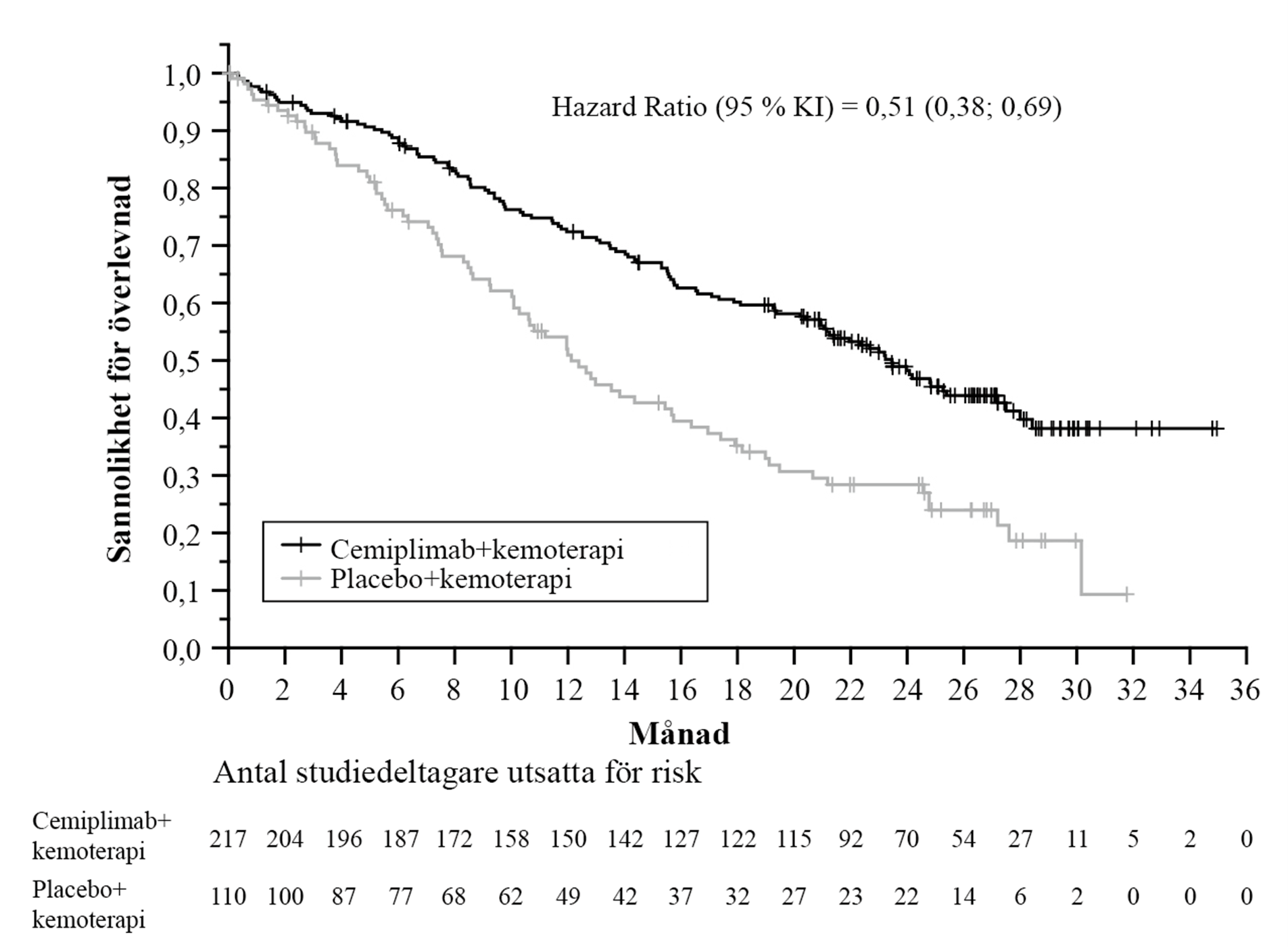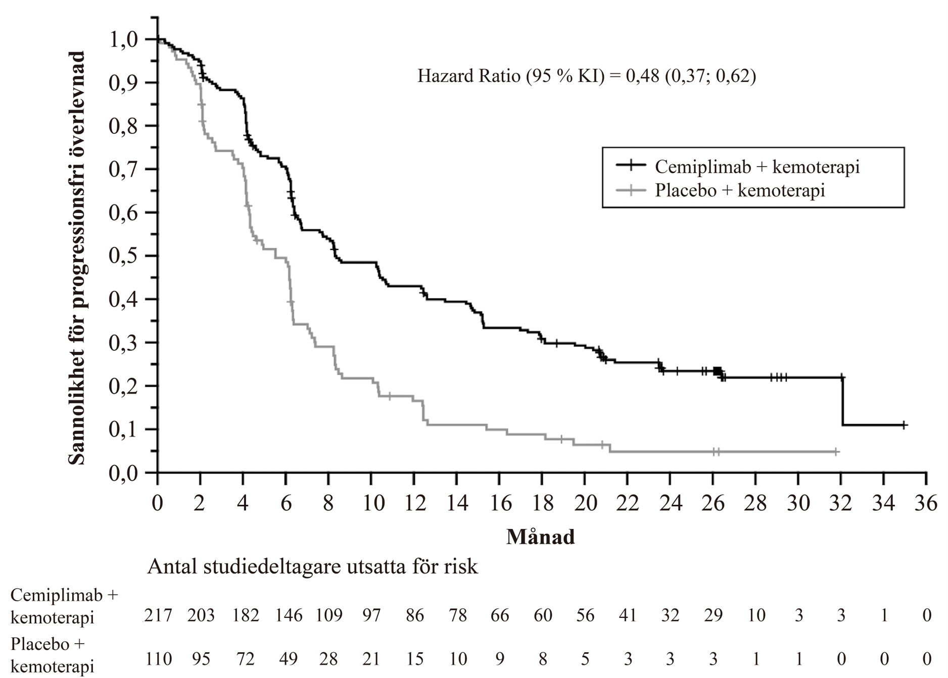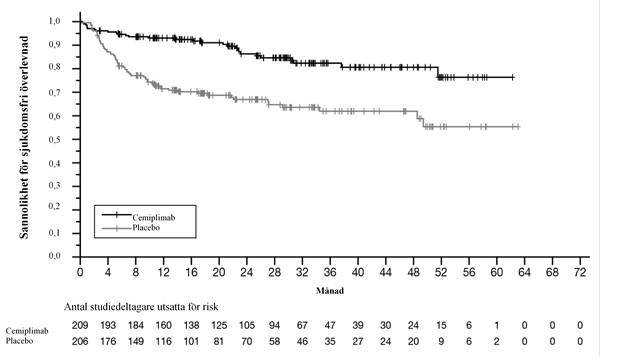 a. Medianduration för uppföljning: cemiplimab och kemoterapi: 15,9 månader, placebo och kemoterapi: 16,1 månader.