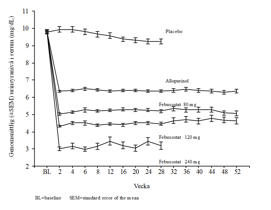 APEX-studien: Den allopurinol- och placebokontrollerade effektstudien på febuxostat (APEX) var en randomiserad, dubbelblind, 28-veckors multicenterstudie i fas 3. Ettusensjuttiotvå (1 072) patienter randomiserades: placebo (n=134), febuxostat 80 mg dagligen (n=267), febuxostat 120 mg dagligen (n=269), febuxostat 240 mg dagligen (n=134) eller allopurinol (300 mg dagligen [n=258] till patienter med en utgångsnivå av serumkreatinin på ≤ 1,5 mg/dl, eller 100 mg dagligen [n=10] till patienter med en utgångsnivå av serumkreatinin på > 1,5 mg/dl och ≤ 2,0 mg/dl). För säkerhetsutvärdering användes en dos om 240 mg febuxostat (2 gånger rekommenderad högsta dos).