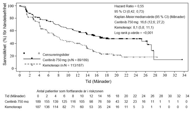 Studien uppnådde sitt primära mål vilket visar en statistiskt signifikant förbättring i progressionsfri överlevnad (PFS) enligt BIRC (se tabell 3 och figur 1). PFS-nyttan av ceritinib var konsekvent enligt prövarens bedömning och mellan olika undergrupper, inklusive ålder, kön, ras, rökningsklass, ECOG-prestationsstatus och sjukdomsbörda.