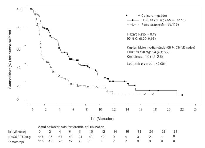 Totalt 376 patienter randomiserades i ett 1:1-förhållande (stratifierat enligt WHO:s prestationsstatus, tidigare adjuvant/neo-adjuvant kemoterapi och närvaro/frånvaro av hjärnmetastaser vid screening) för att få antingen ceritinib (750 mg dagligen, fastande) eller kemoterapi (enligt prövaren – pemetrexed [500 mg/m2] plus cisplatin [75 mg/m2] eller karboplatin [AUC 5-6] administrerad var 21:a dag). Patienter som genomförde 4 cykler av kemoterapi (induktion) utan progressiv sjukdom fick därefter pemetrexed (500 mg/m2) som enstaka underhållsbehandling var 21:a dag. Etthundraåttionio (189) patienter randomiserades till ceritinib och etthundraåttiosju (187) randomiserades till kemoterapi.