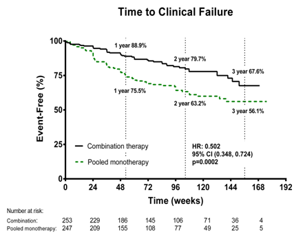 Kombinationsbehandlingen resulterade i en 50 % riskreduktion (riskkvot [HR] 0,502; 95 % CI: 0,348–0,724; p = 0,0002) avseende det sammansatta effektmåttet för klinisk behandlingssvikt fram till det sista besöket, i jämförelse med den sammanslagna monoterapigruppen [figur 1 och tabell 1]. Behandlingseffekten visades genom en 63-procentig minskning av sjukhusinläggningar med kombinationsbehandlingen, etablerades tidigt och kvarstod. Effekten av kombinationsbehandling på det primära effektmåttet var konsekvent vid jämförelse med de enskilda monoterapierna och i de olika undergrupperna, indelade efter ålder, etniskt ursprung, geografisk region och etiologi (IPAH/hPAH och PAH-CTD). Effekten var signifikant både för patienter med funktionsklass II och funktionsklass III.