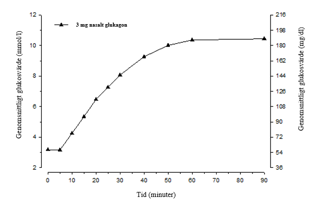 Efter administrering av 3 mg glukagon näspulver till vuxna patienter med typ 1-diabetes började glukosnivåerna öka redan efter 5 minuter (se figur 1). Efter 10 minuter låg medianglukosvärdet över 3,9 mmol/l (70 mg/dl). Den genomsnittliga maximala glukoshöjningen var 7,8 mmol/l (140 mg/dl).