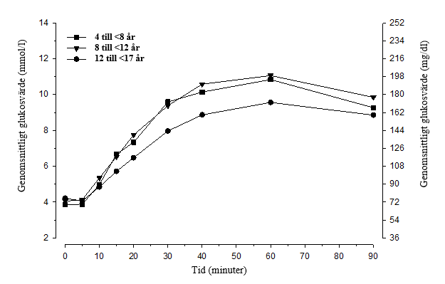 Tabell 4. Genomsnittlig tid för att nå en glukosökning på 1,1 mmol/l (≥20 mg/dl) från lägsta värdet i den pediatriska huvudstudien