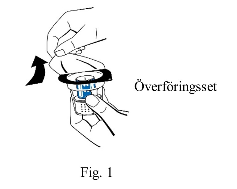 Överföringssetet måste först anslutas till injektionsflaskan med spädningsvätska och sedan till flaskan med frystorkat pulver. I annat fall går vakuumet förlorat och ingen överföring av spädningsvätskan sker.