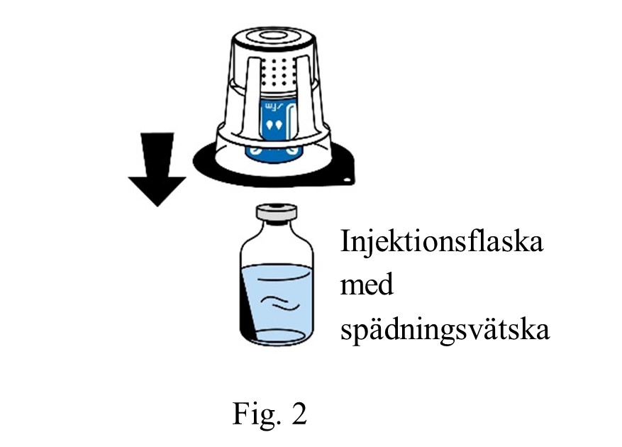4. Placera injektionsflaskan med spädningsvätska på en slät, ren yta och håll den i ett stadigt grepp. Låt blisterförpackningen sitta kvar över överföringssetet och placera överföringssetets blå del ovanpå injektionsflaskan med spädningsvätska. Tryck stadigt rakt ned tills överföringssetet snäpper på plats (fig. 2). Vrid inte när du fäster.