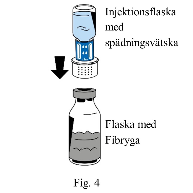 6. Placera flaskan med pulver (Fibryga) på en slät, ren yta och håll den i ett stadigt grepp. Fatta injektionsflaskan med spädningsvätska med överföringssetet anslutet och vänd upp och ned. Placera kopplingen på överföringssetets vita del ovanpå flaskan med pulver (Fibryga). Tryck, utan att vrida, stadigt ned tills överföringssetet snäpper på plats (fig. 4). Spädningsvätskan rinner nu automatiskt ner i flaskan med pulver (Fibryga).