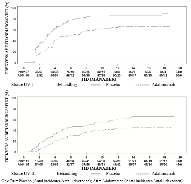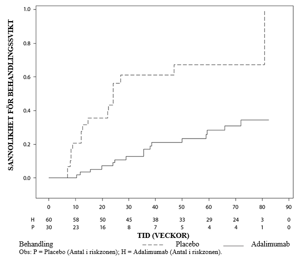 Adalimumab fördröjde signifikant tiden till behandlingssvikt i jämförelse med placebo (se figur 2, P < 0,0001 från log rank-test). Mediantiden till behandlingssvikt var 24,1 veckor för patienter som behandlades med placebo, medan mediantiden till behandlingssvikt för patienter som behandlades med adalimumab inte gick att fastställa eftersom mindre än hälften av dessa patienter upplevde behandlingssvikt. Adalimumab minskade signifikant risken för behandlingssvikt med 75 % jämfört med placebo, vilket framgår av hazardkvoten (HR = 0,25 [95 % KI: 0,12; 0,49]).