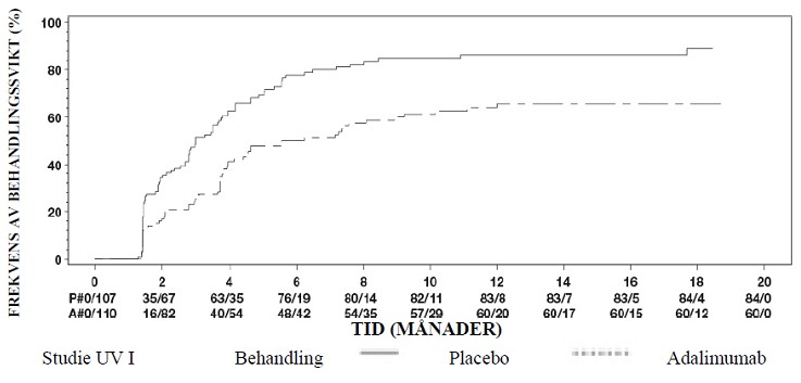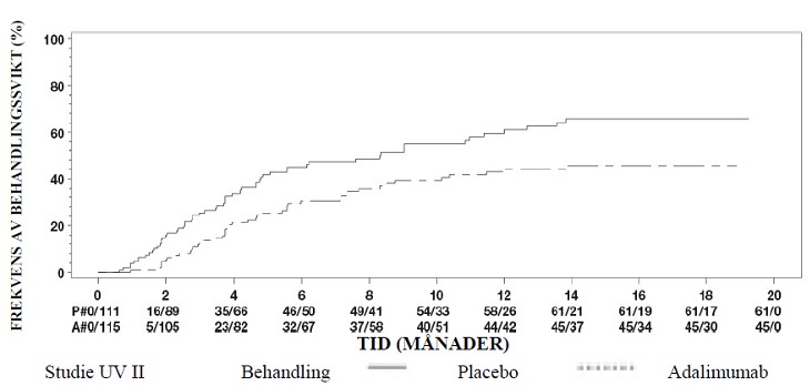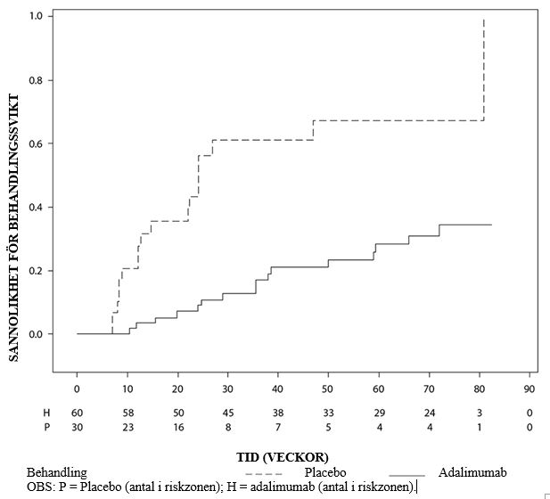 Adalimumab fördröjde signifikant tiden till behandlingssvikt i jämförelse med placebo (se figur 2, P < 0,0001 från log rank test). Mediantiden till behandlingssvikt var 24,1 veckor för patienter som behandlades med placebo, medan mediantiden till behandlingssvikt för patienter som behandlades med adalimumab inte gick att fastställa eftersom mindre än hälften av dessa patienter uppvisade behandlingssvikt. Adalimumab minskade signifikant risken för behandlingssvikt med 75 % jämfört med placebo, vilket framgår av hazardkvoten (HR = 0,25 [95 % CI: 0,12; 0,49]).